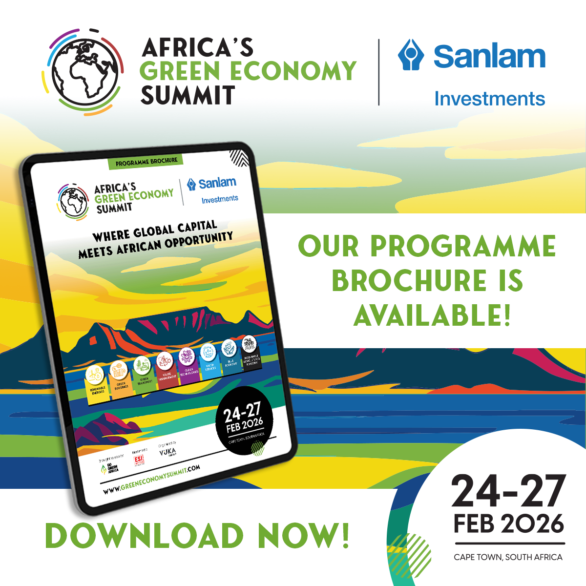 CAPE TOWN, South Africa, November 21, 2025/ — The critical climate negotiations at COP30 in Belém, Brazil, are underscoring the urgent need to translate global ambition into tangible investment and action. This imperative resonates directly with the upcoming fourth edition of the Africa’s Green Economy Summit (AGES), scheduled for 24–27 February 2026 at the Century City Conference Centre in Cape Town. Africa’s transition to a climate-resilient, low-carbon future will take centre stage at the event—powered by lead partner Sanlam Investments. This year’s edition underscores a shared commitment to accelerating investment into Africa’s green and blue economies at a defining moment for global climate action.