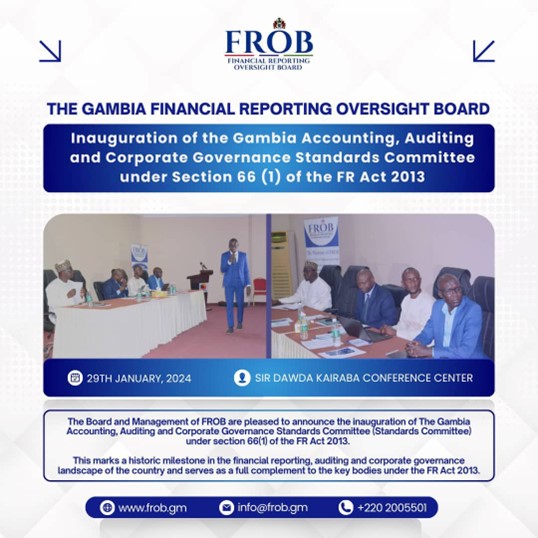 We have obtained information that the Financial Reporting Oversight Board (FROB) will inaugurate the Gambia Accounting, Auditing, and Corporate Governance Standards Committee (henceforth referred to as the Standards Committee) on Wednesday, 29 January 2024. Considering the legal and procedural requirements for establishing this august body, we are hugely concerned about this development. We have noted that this Committee is being established in total contravention of the Financial Reporting Act 2013, which is a concern for professionalism, transparency, and accountability in the financial reporting system in the country.