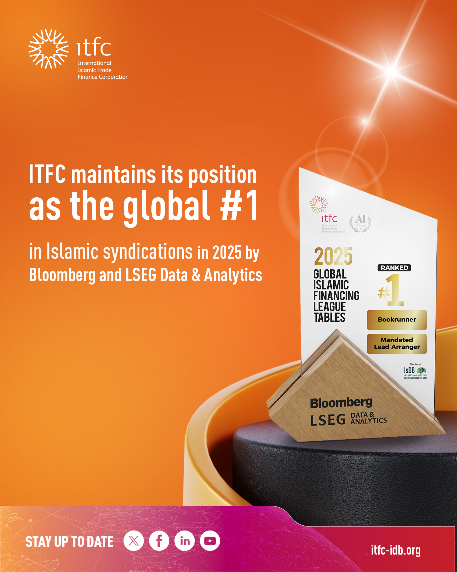 JEDDAH, Saudi Arabia, January 13, 2026/ — The International Islamic Trade Finance Corporation (ITFC) (www.ITFC-IDB.org), a member of the Islamic Development Bank (IsDB) Group, has been ranked Global #1 Bookrunner and Mandated Lead Arranger (MLA) in the 2025 Bloomberg and LSEG Data & Analytics Islamic Syndications League Tables, marking five consecutive years of leadership in the Islamic syndications market.