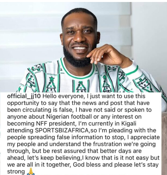 Super Eagles icon Augustine ‘Jay-Jay’ Okocha has responded to speculation regarding his desire to run for the presidency of the Nigeria Football Federation (NFF).