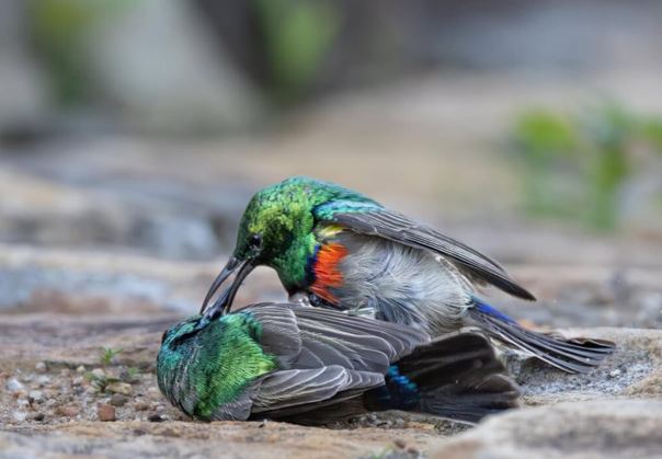 A captivating photo series by Warren Joffe showcases an intense territorial battle between Southern Double-collared Sunbirds, highlighting their vibrant plumage and combative behavior.